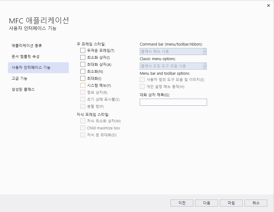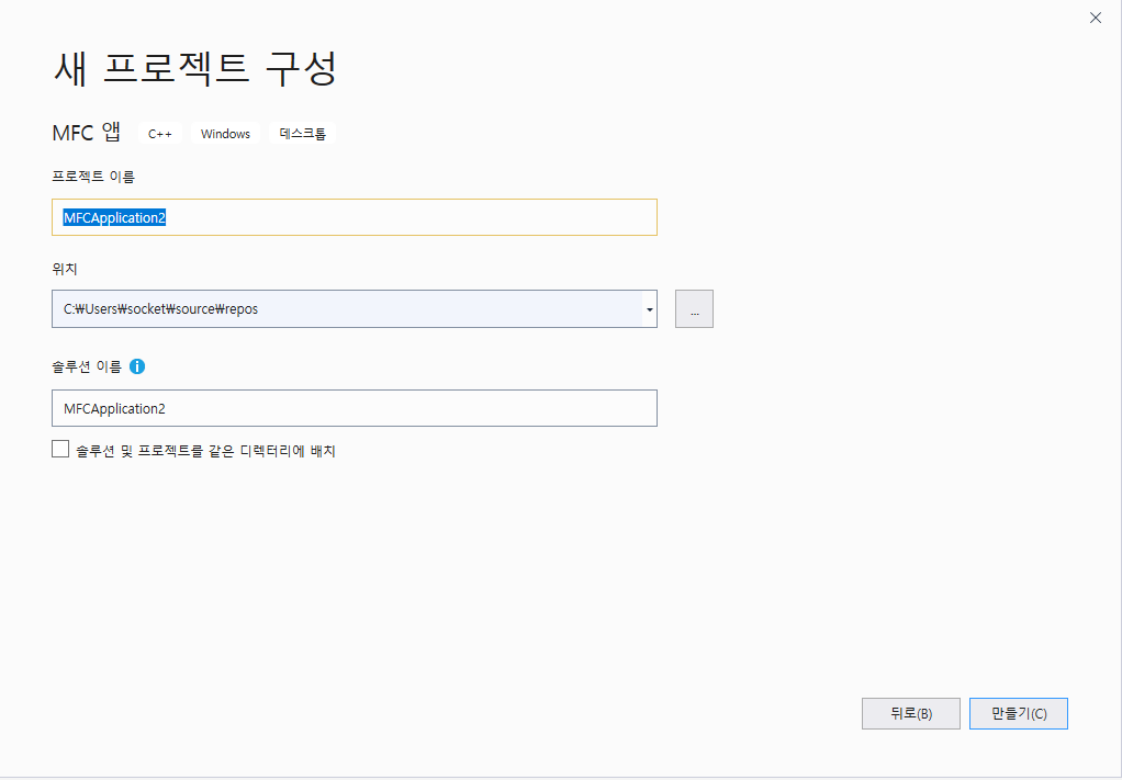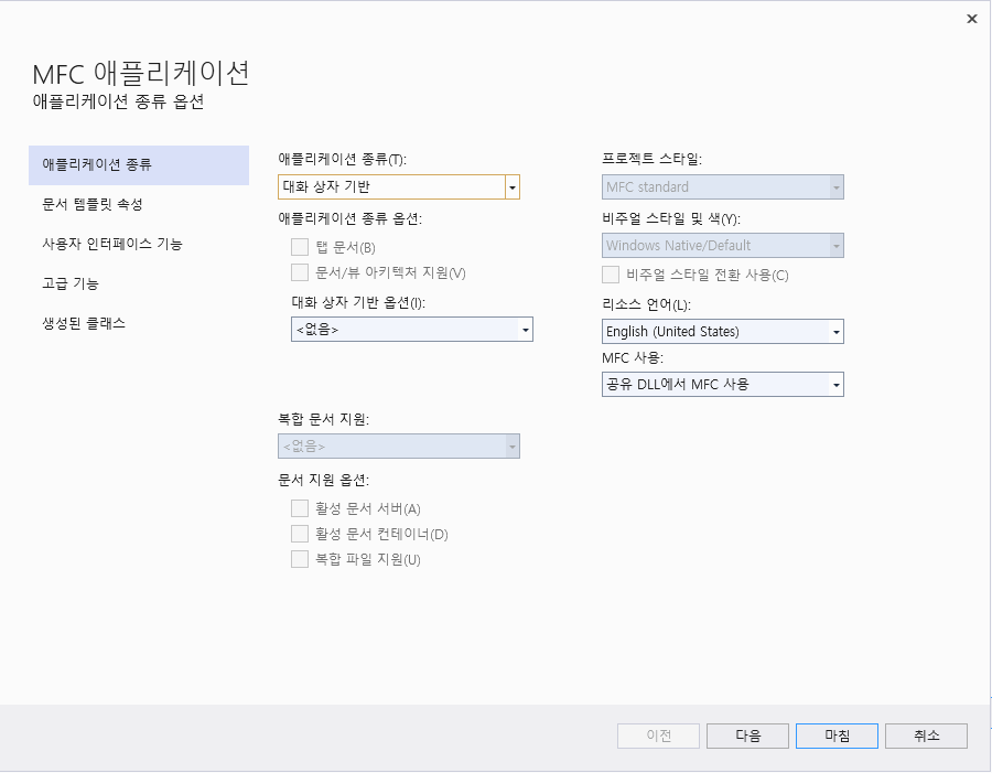이번 예제에서는 "대화 상자 기반"으로 하였습니다.
