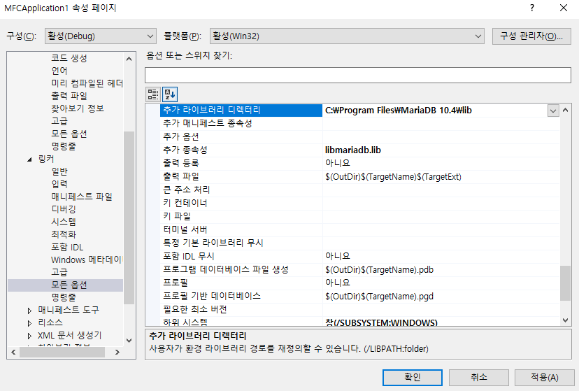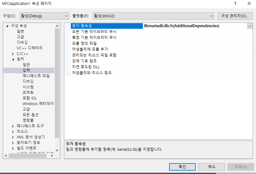 "링커->추가 종속성" libmariadb.lib로 설정해주기