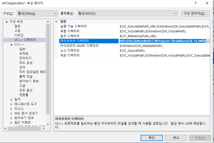 "VC++ 디렉터리->" 라이브러리 디렉터리 : C:\................\MariaDB XX.X\lib