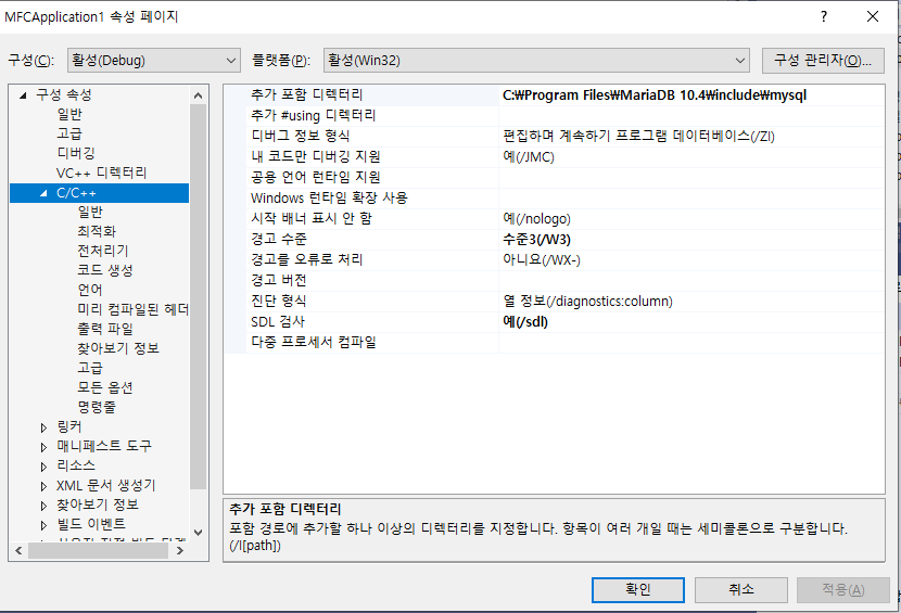 "C/C++->추가 포함 디렉터리": C:\................\MariaDB XX.X\include\mysql