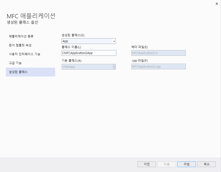 생성된 클래스의 이름 등을 확인하고 "마침"을 클릭합니다.
