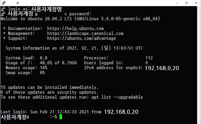그림 25. 처음부팅 모습 / 우분투 서버 20.04(2021-02-21)
