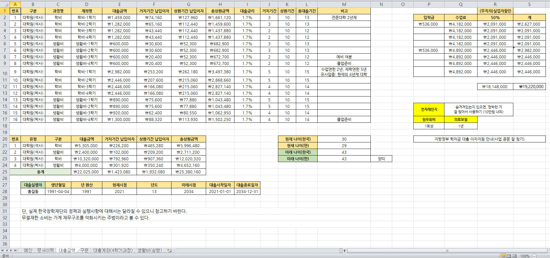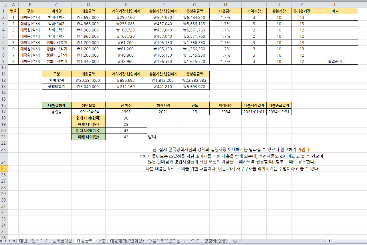 학자금 대출과 생활비 대출에 대한 현금흐름 시나리오에 대해서 살펴보았다.