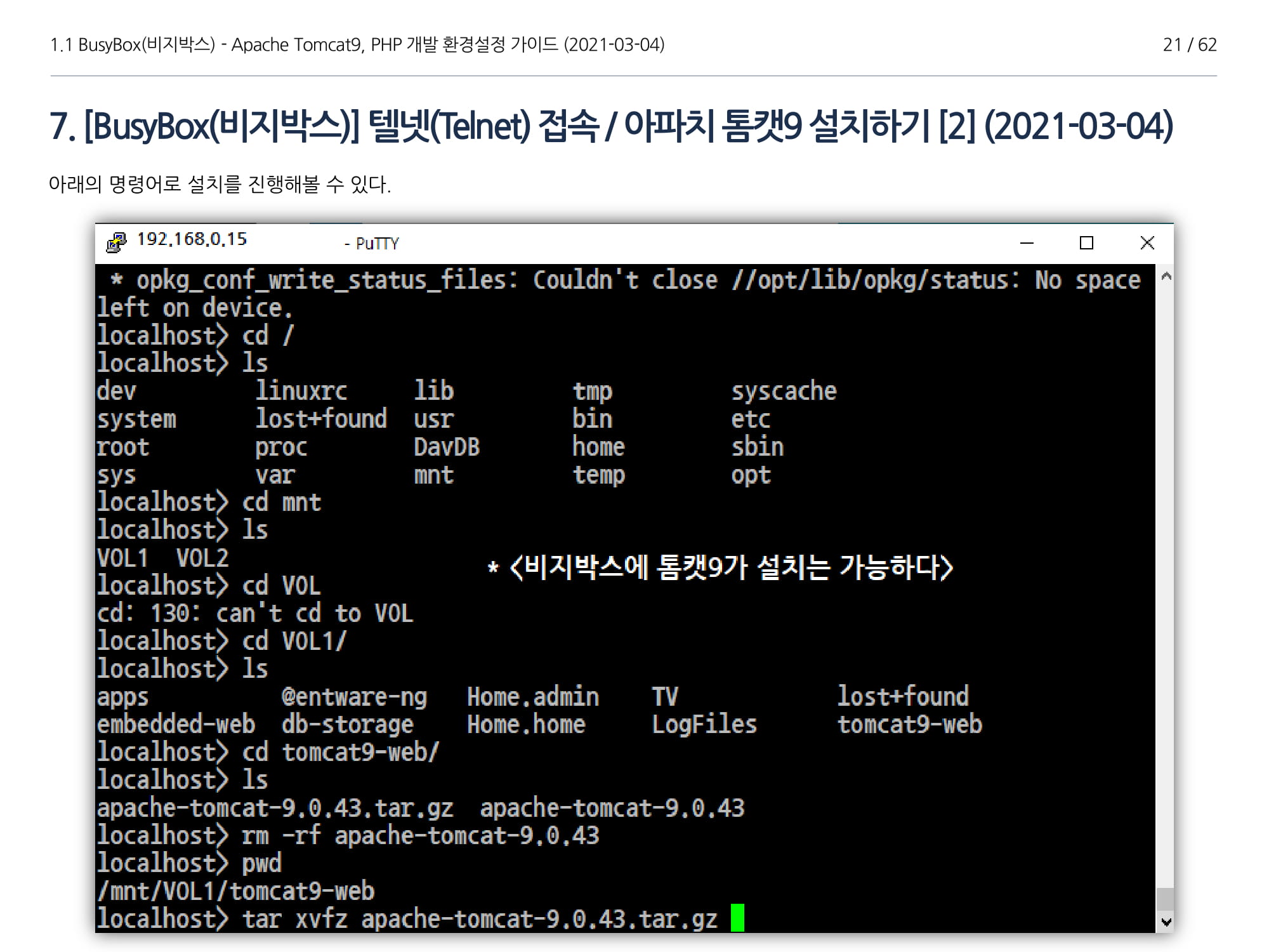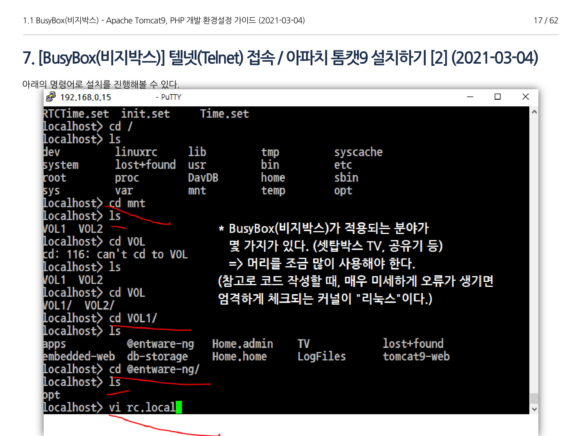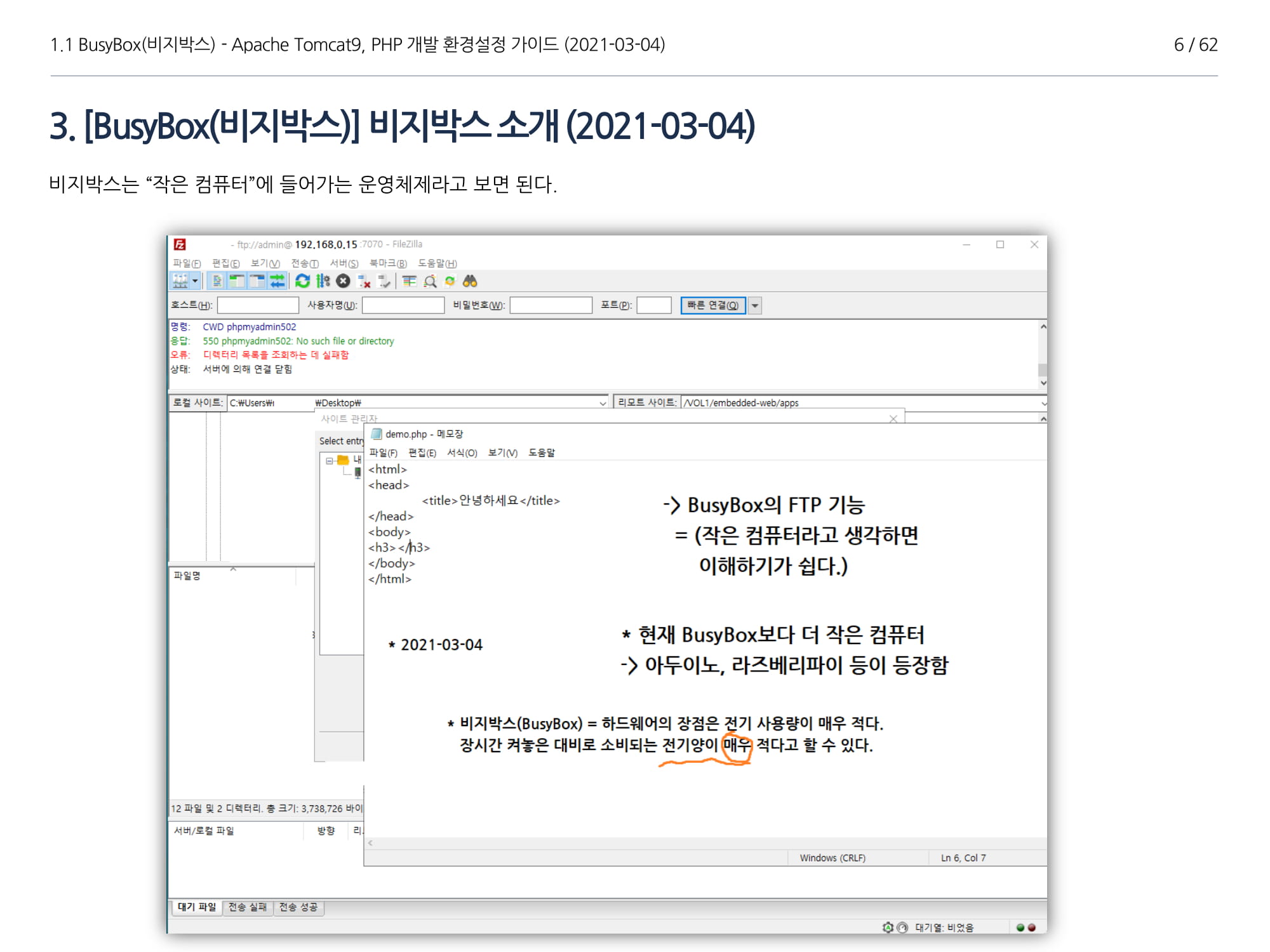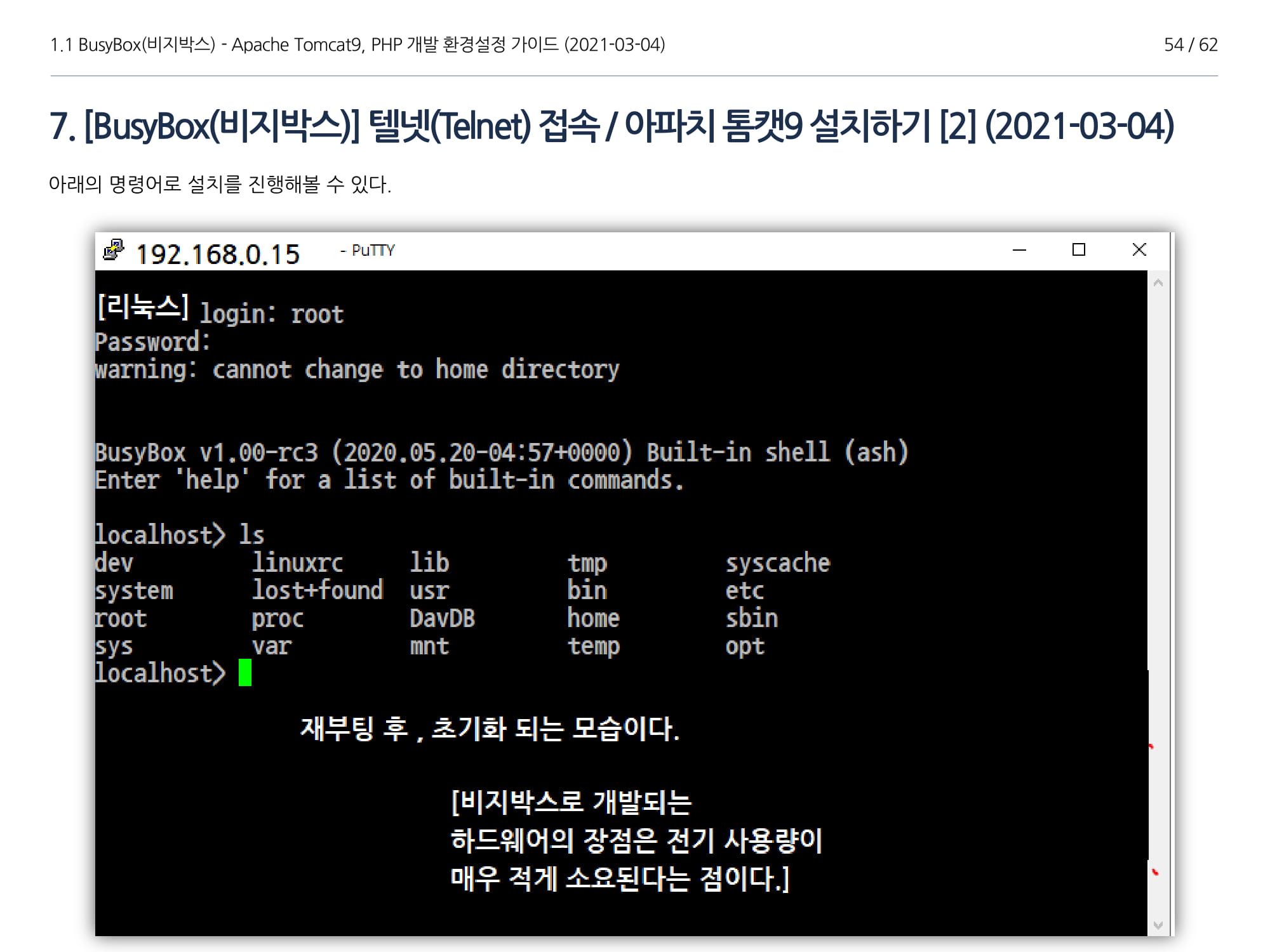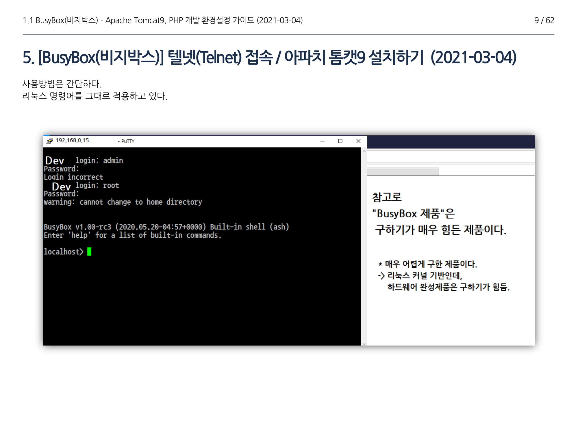 BusyBox에서 아파치톰캣9과 임베디드 Java 1.8버전 설치, PHP 개발에 대해서 소개하였다.