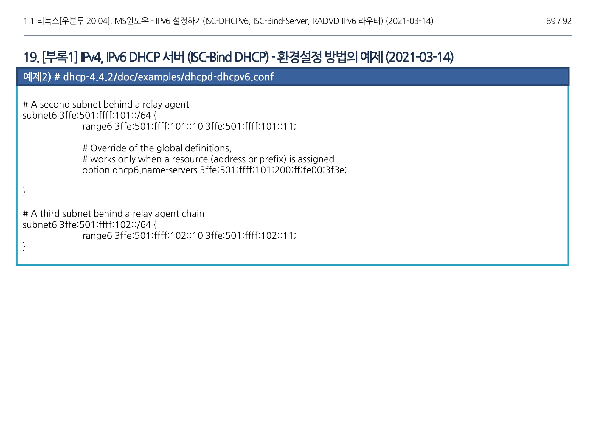| [GNU(리눅스[Linux])] 우분투 20.04, ISC-Bind-Server, DHCPv6, RADVD(IPv6) 구축하기(1부) / 2021-03-14 19:40 https://yyman.tistory.com/1513 |