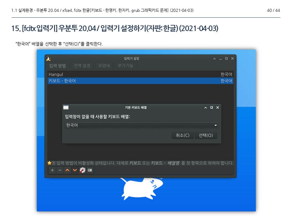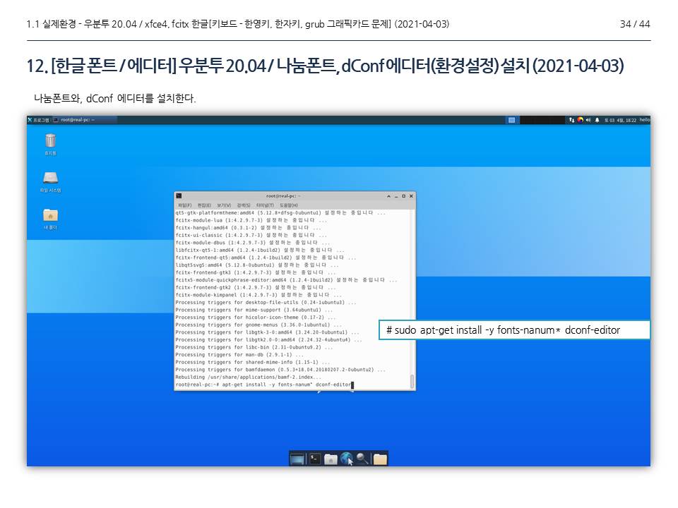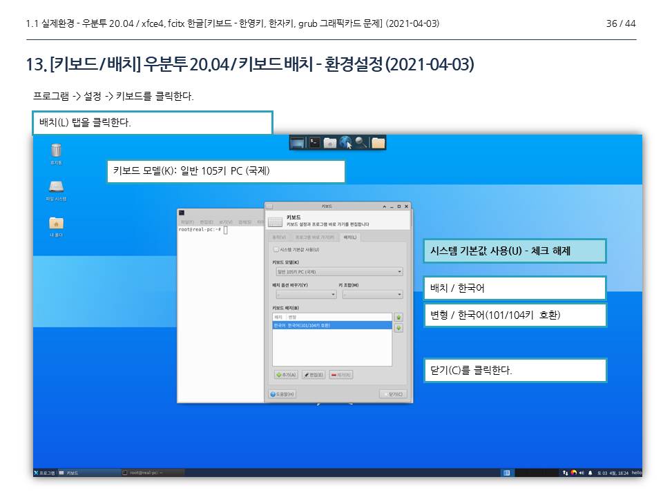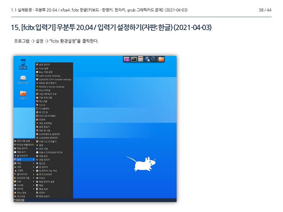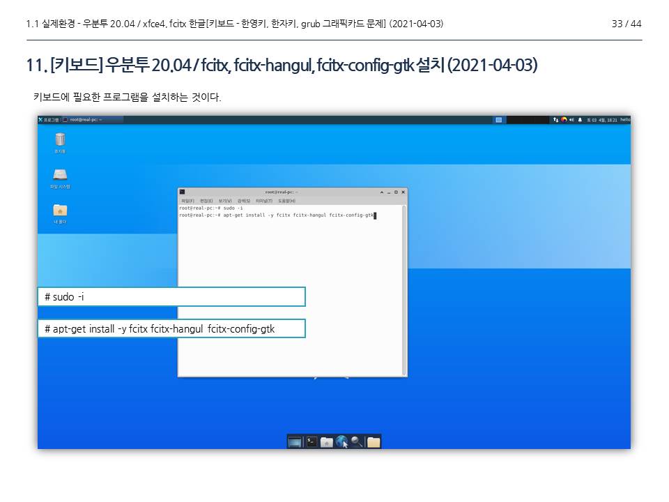 실제환경에서 우분투 20.04, xfce4, fcitx 등을 적용하는 방법에 대해서 소개하였다.