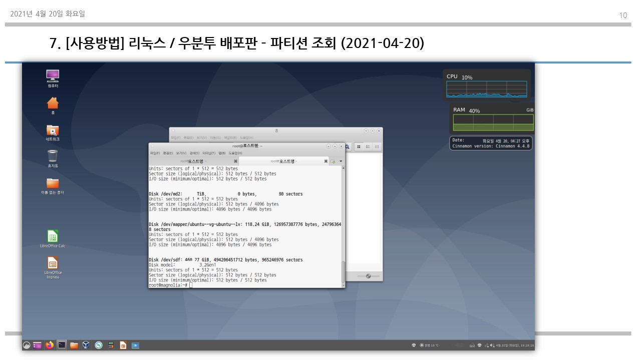 리눅스 배포판에서 로우레벨포멧, fdisk 사용방법, 베라크립트(VeraCrypt), 네트워크 드라이브(삼바, Cifs, NFS)를 IPv4, IPv6에서 사용하는 방법에 대해서 소개하였다.