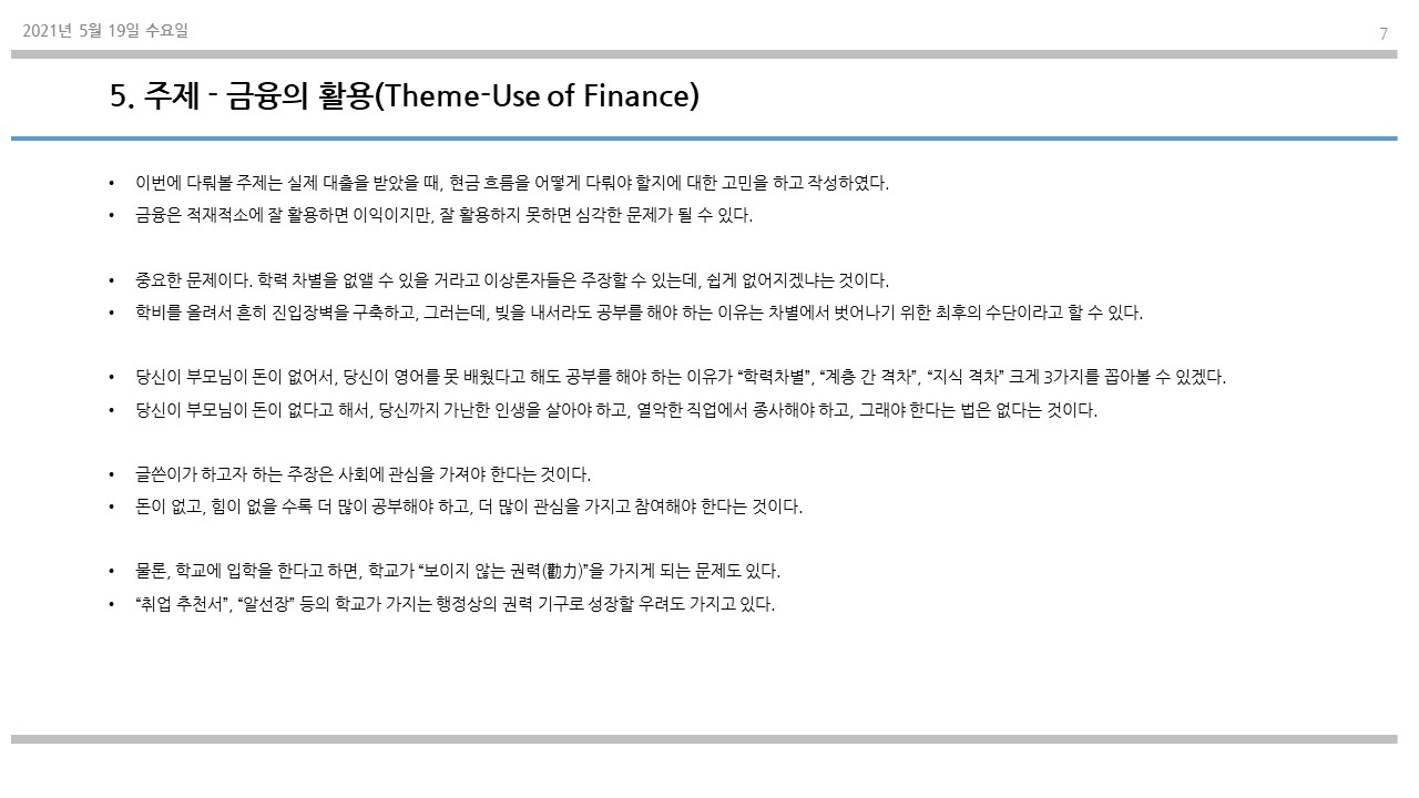 이번에 작성한 글은 현금 일정을 보고, 바르게 판단하는 방법이 매우 중요하다는 것을 알 수 있는 주제의 글이 될 수 있겠다.