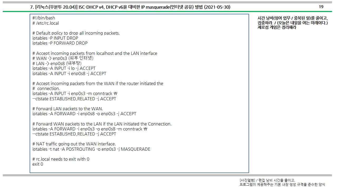 리눅스 배포판 "우분투 20.04"에서 ISC-DHCP-Server를 활용하여 iptables 방화벽을 통한 ip 매스퀘이드를 활용한 인터넷 공유를 하는 방법에 대해서 살펴보았다.