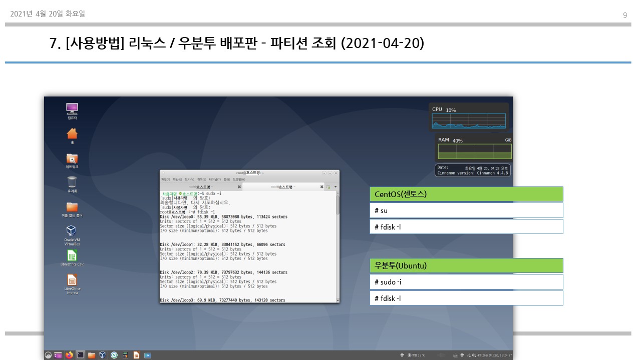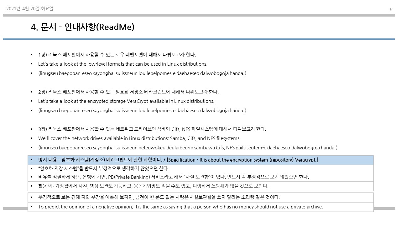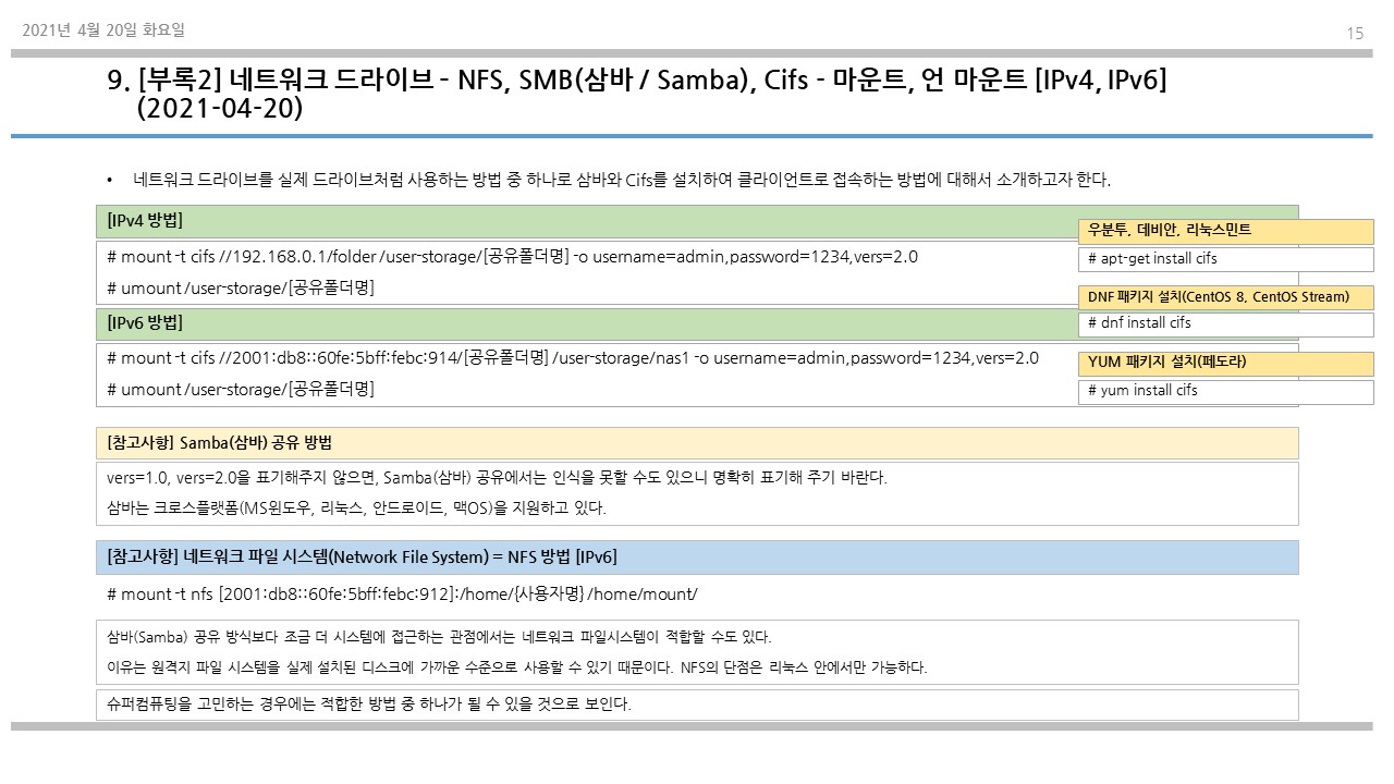 리눅스 배포판에서 로우레벨포멧, fdisk 사용방법, 베라크립트(VeraCrypt), 네트워크 드라이브(삼바, Cifs, NFS)를 IPv4, IPv6에서 사용하는 방법에 대해서 소개하였다.