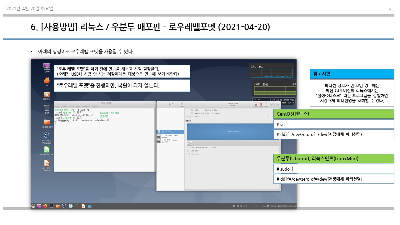 아래의 내용처럼 리눅스 배포판에서 로우레벨 포멧, 암호화 저장소 베라크립트, 네트워크 드라이브인 삼바와 Cifs, NFS 파일시스템에 대해서