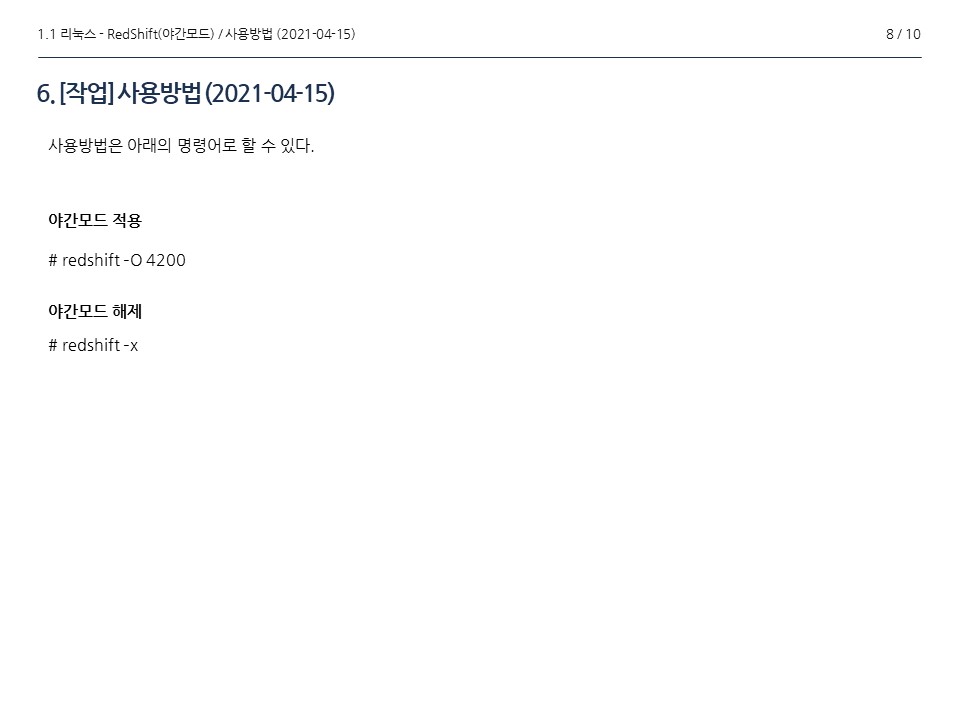 리눅스에서 야간모드로 시력의 피로도를 감소하는 방법에 대해서 살펴보았다.